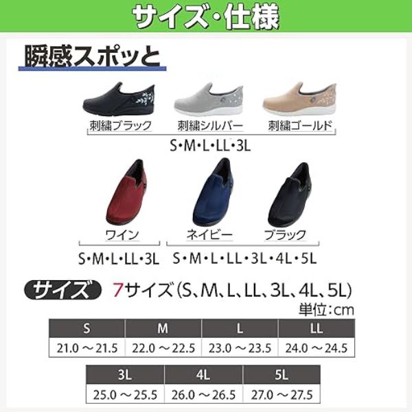 ●サイズ/S:21.0~21.5cm、M:22.0~22.5cm、L:23.0~23.5cm、LL:24.0~24.5cm、3L:25.0~25.5cm、4L:26.0~26.5cm、5L:27.0~27.5cm(刺繍ブラック・刺繍ゴールド・刺繍シルバー・ワインのみS~3L) ワイズ:3E●重さ/約165g(片足Lサイズ)●材質:表・裏素材:ポリエステル100% 底材:EVA樹脂●生産国:中国●屋外&室内用●男女兼用
