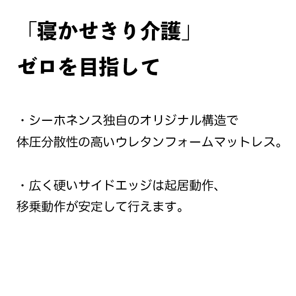 シーホネンス独自のオリジナル構造で体圧分散性の高いウレタンフォームマットレス。広く硬いサイドエッジは起居動作、移乗動作が安定して行えます。